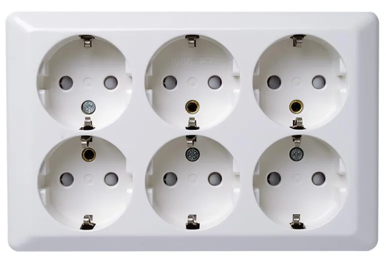 Pistorasia 6:lla sukopistorasiapesällä. Halogeenittomasta kestomuovista. Pohjalevyssä ”knock out”-reiät kojerasian päällistä asennusta varten.