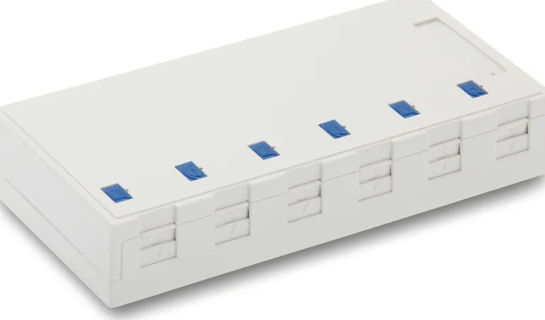 Pistorasialaatikko Keystone RJ45 -liittimelle pölysuojalla. Laatikko soveltuu jopa kuudelle laatikolle/liittimelle, pinta-asennukseen.