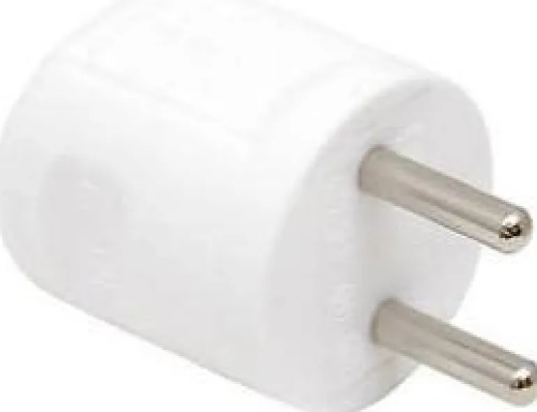 16 A valkoinen maadoittamaton termoplasti-pistoke. Suora kaapelitulo ja nimellisjännite 250 V.
