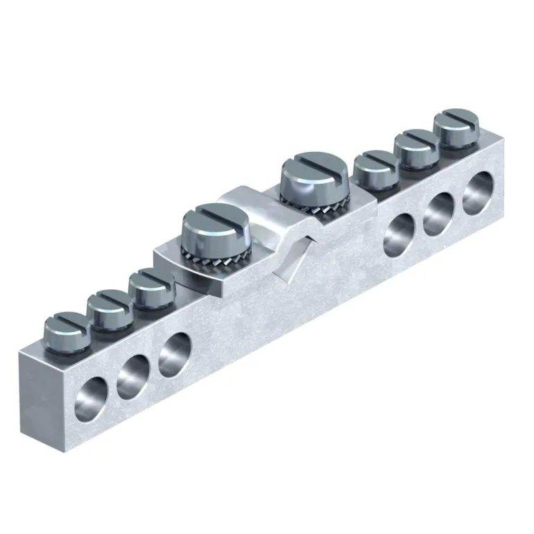 Laite- tai liitäntärasiaan upotettava. Messingistä valmistettu kisko 6 liitännällä: 1,5-10 mm2 ja 1 liitännällä: RD 8-10 mm.