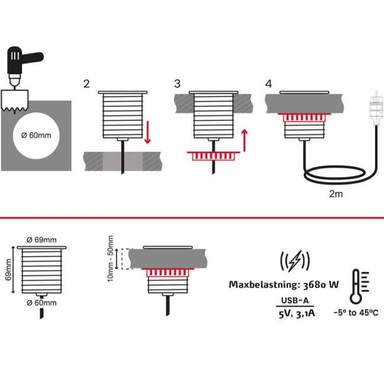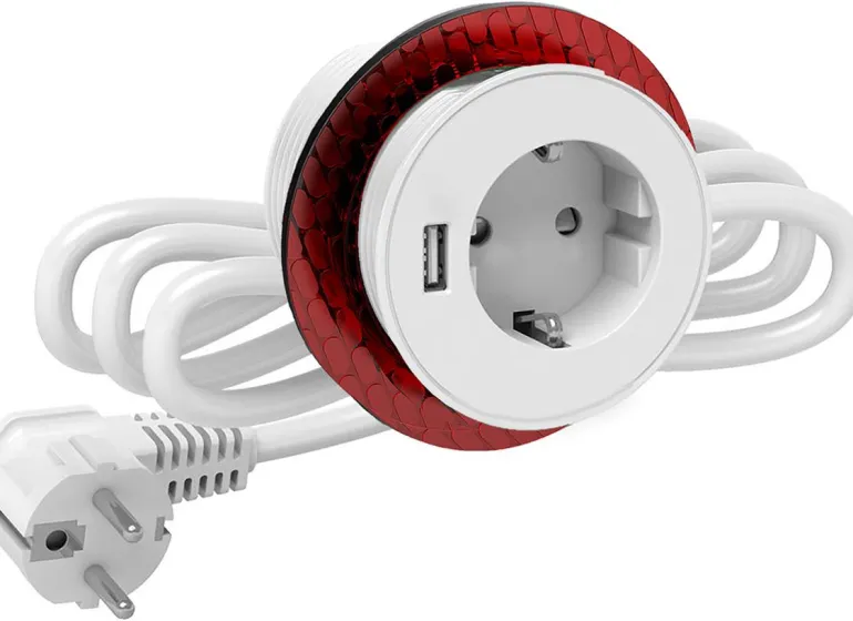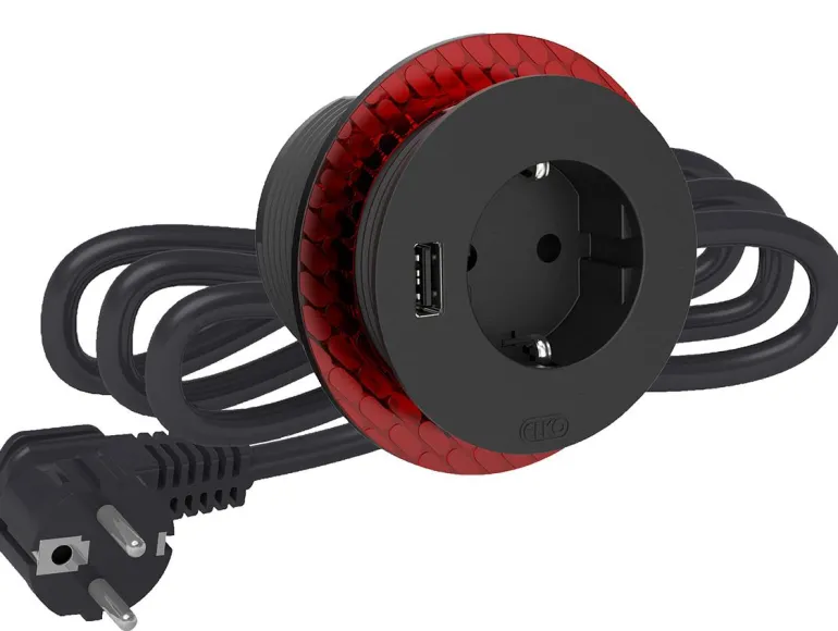 Pöytäpistorasia Schuko/USB-pistorasialla siistiin ja helppoon asennukseen. 2 metrin liitäntäjohdolla ja pöly- sekä roiskesuojalla. Sopii asennettavaksi kaikentyyppisille pöytäpinnoille.