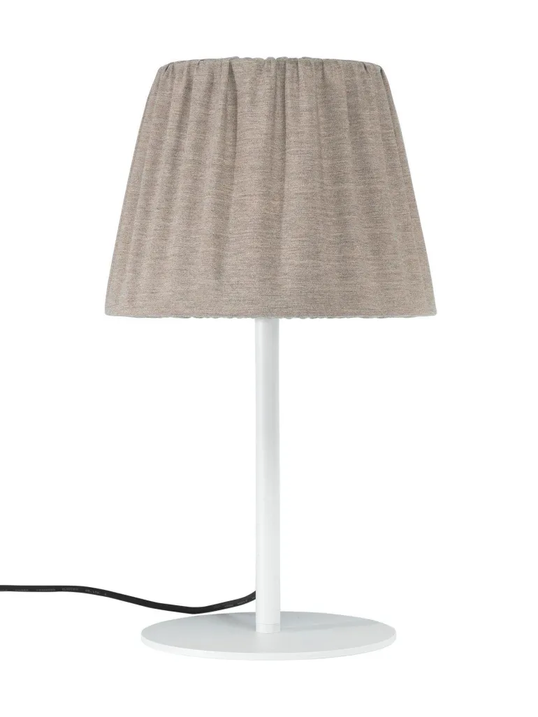 Agnar-pöytävalaisin ulkokäyttöön. Lampunvarjostin on valmistettu 100% akryylidralonista valmistetusta kankaasta, joka kestää hyvin sääolosuhteita. Meleerattu kangas (OEKO-TEX® Standard 100 -sertifioitu) korkealla valonkestävyydellä (5–7) ja vettä ja likaa hylkivällä teflonkäsittelyllä. Varjostimen teline on sinkitty ruostumisen ehkäisemiseksi. Valaisimessa E27-kanta, ja suositeltu valonlähde on 1806404 (PR Home). Valonlähteen ja lampun kannan päällä on valkoinen muovikansi ja tiiviste, jotka suojaavat kosteudelta. Varjostin kiinnitetään jalkaan erikoiskiinnikkeellä. Jalka ja varjostin myydään vain settinä.