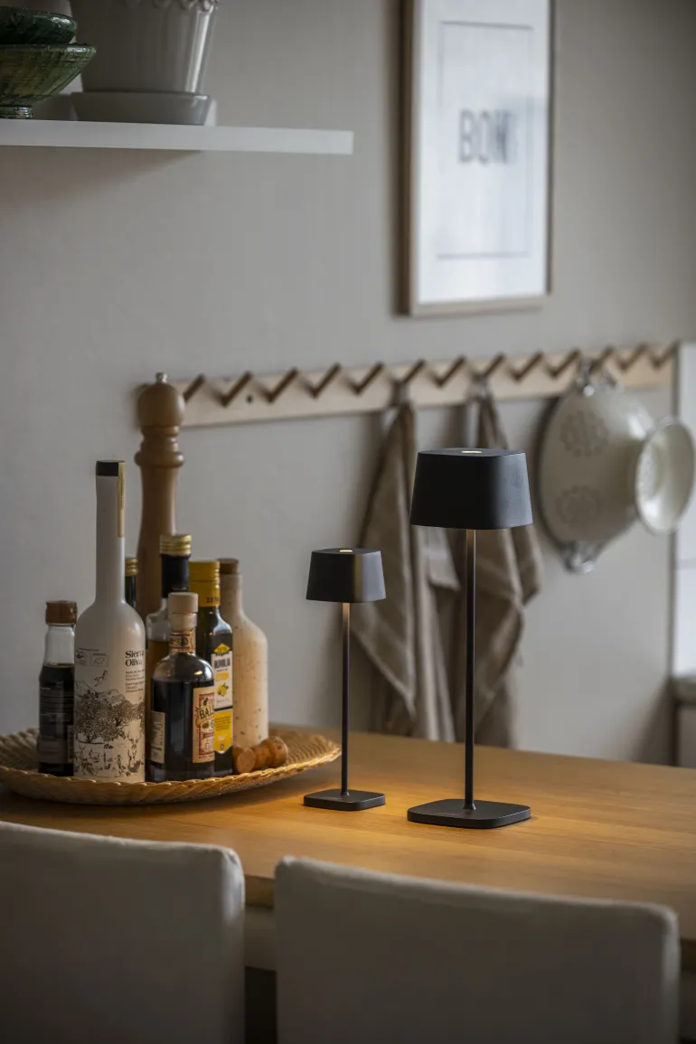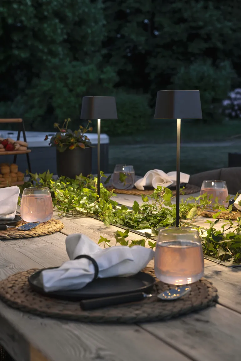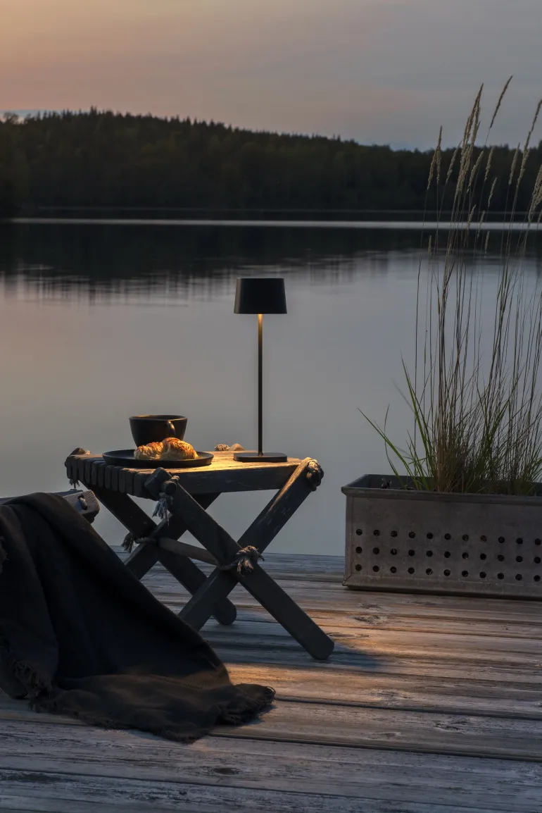 Capri on tyylikäs pöytävalaisin mustaksi lakattua alumiinia. Siinä on säädettävä ja himmennettävä valaistus eri värilämpötiloilla, ja se sopii yhtä hyvin olohuoneeseen kuin terassille. Ladataan USB:n kautta ja akun kesto on noin 9 tuntia täydellä valoteholla. Virtapainike toimii kosketuksella varjostimen pinnasta. Korkeus 36 cm.