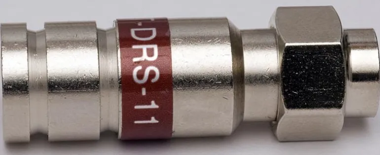 Kompressiokytkin RG-59:lle, F-koiras. Ulomman O-renkaan avulla saadaan aikaan täysi metallikosketus mutterin ja liittimen välillä. Tämä varmistaa, että liitin saa oikean vääntömomentin sekä oikean impedanssin. TRS-liitinten kotelo on hieman normaalia lyhyempi, joten ne sopivat käytettäviksi ahtaissa tiloissa.