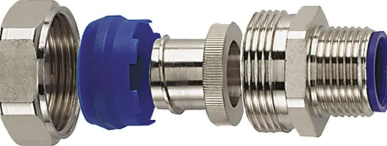 HelaGuard LTS-FMC -puristusliitin. Ulkokierteet nikkelipinnoitettua messinkiä, IP66, IP67 ja IP68. Mukana polyamiditiiviste. Voidaan käyttää esipuristettuihin reikiin tai kierreliitäntään: kytkin kiertyy, kunnes se on tiukasti kiristetty.