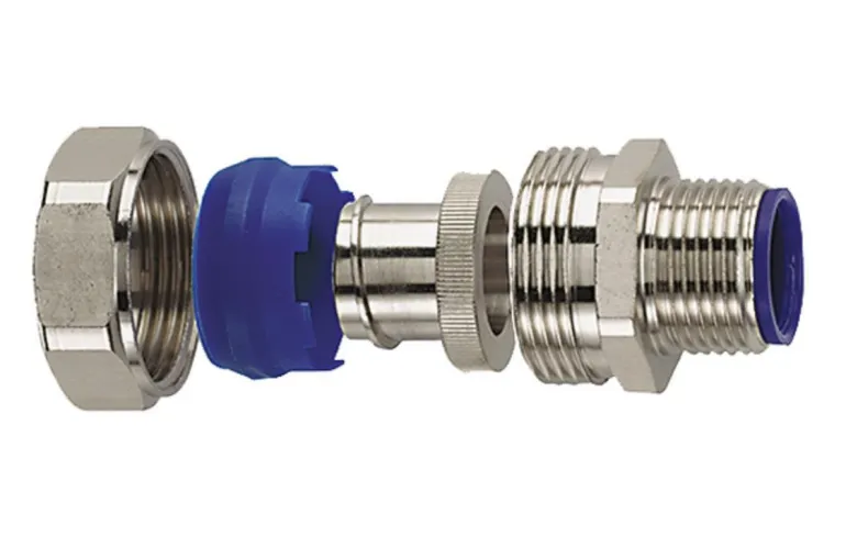 HelaGuard LTS-FMC -puristusliitin. Ulkokierteet nikkelipinnoitettua messinkiä, IP66, IP67 ja IP68.