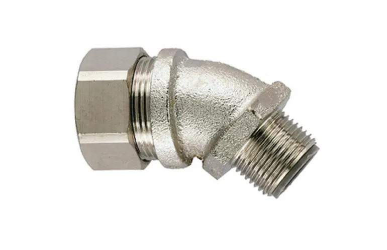 HelaGuard LTS-45FMC 45° -kulmapuristusliitin, IP-luokka 68. Nikkelipinnoitetusta messingistä valmistetut ulkokierteet, moniosainen puristusliitin, mukana polyamiditiiviste.