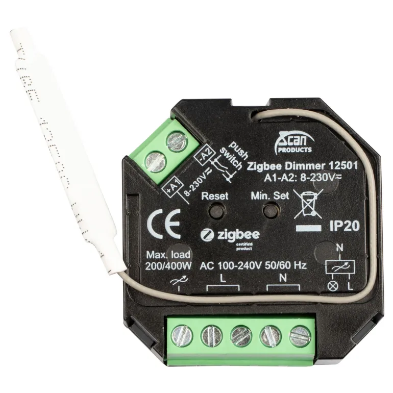 Rasiahimmennin Zigbee 3.0 200 W LED / 400 W, Integroitu Zigbee 3.0 -tiedonsiirtomoduuli, yhteensopiva johtavien Zigbee-yhdyskäytävien, kuten Philips Hue ja Samsung Smart-Things, kanssa. 8–230 V:n ohjausjännite mahdollistaa myös ohjauksen virtakytkimellä, joko painikkeella (matalajännite) tai tavallisella impulssijousikoskettimella. Voidaan asentaa useimpiin laiterasioihin. Himmentimessä on myös muistitoiminto.