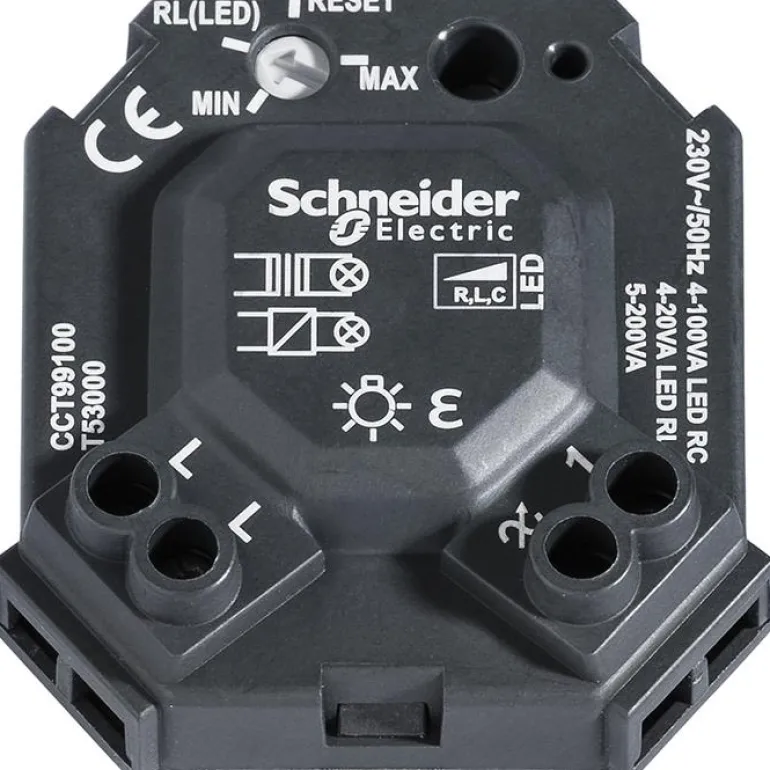 Schneider WDE008301 on yleishimmennin 4-100 W, asennetaan jousipalautteisen virtakytkimen taakse. Himmennintä voidaan käyttää LEDien, hehkulamppujen, 230 V:n halogeenilamppujen ja useimpien elektronisten muuntajien valonsäätöön. Soveltuu asennettavaksi vakioasennusrasiaan, säätö mekaanisilla painikkeilla rinnakkaiskäytössä. Impulssijousi ei sisälly toimitukseen.