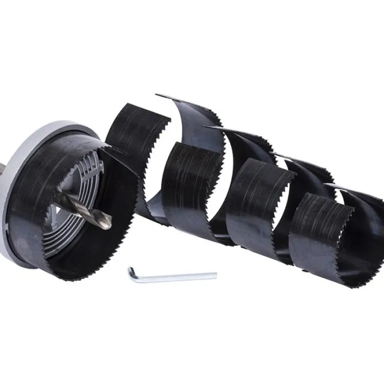 5-osainen reikäsahasarja, sopii useimpiin rasioihin, Sahanterien mitat ovat Ø 60, 67, 74, 83 ja 95 mm. Sarjaa voidaan käyttää myös useiden halogeeni- ja LED-valojen asentamiseen. Mukana on kuusiokoloavain.