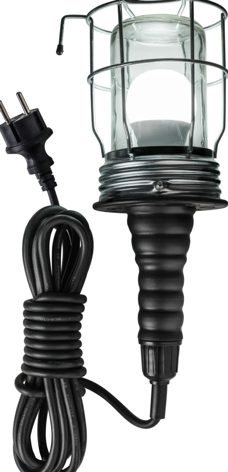 Roiskevesitiivis lisä-, työ- ja remonttivalo on tarkoitettu sisä- ja ulkokäyttöön. Kestävä muotoilu ja tehokkaasti valaiseva (sopii hyvin myös industrial-/teollistyyliseen sisustukseen). Tiivis lasikupu ja metallikori suojaa lamppua hyvin. Johto 5 m mustaa kumikaapelia pistotulpalla. Lamppu myydään erikseen.