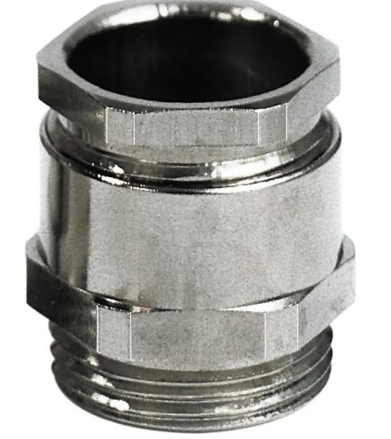 Nikkelipinnoitettu messinkinen kaapelitiiviste. Kuusikulmainen ulompi holkki kierteillä DIN 46320, sekä leikattava kumitiiviste ja kaksi aluslevyä galvanoitua terästä.
