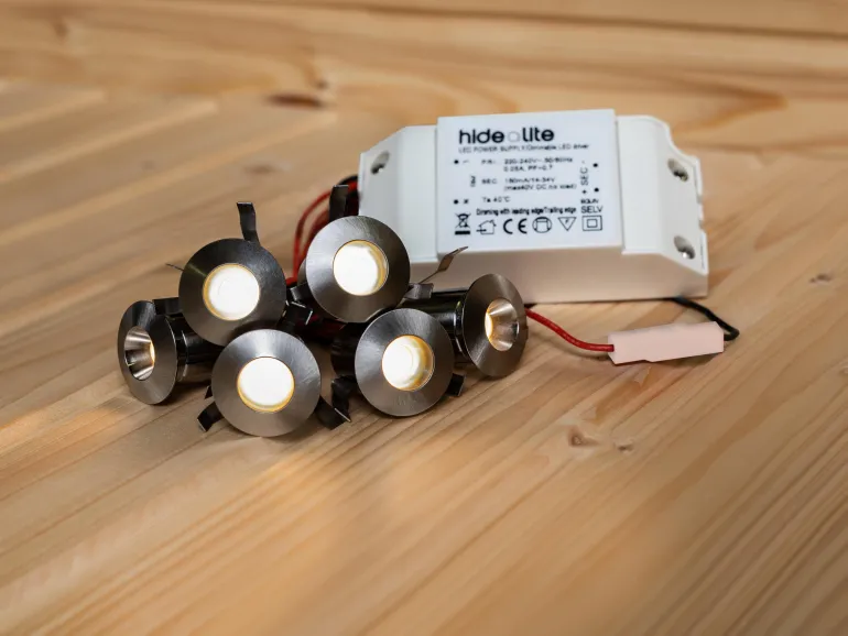 Täydellinen sarja, jonka avulla on helppo asentaa huomaamattomia ja tunnelmallisia pieniä valopisteitä saunan valaistukseksi. Harjatusta teräksestä valmistetut valaisimet, joissa on mukautettu valon virtaus häikäisyn estämiseksi. Valaisimissa on kaksi kaapelia sekä pikaliitäntä kätevää sarjakytkentää varten. Sarjassa on 6 kpl valaisinta, joissa on vaihehimmennettävä ohjain, jatkokaapeli ja liitäntäjohdot. Ohjaimella voidaan käyttää ja himmentää 5-12 valaisinta.