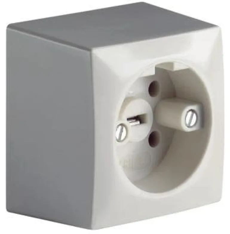 Pinta-asennettava perilex-pistorasia. Suojausluokka IP20 ja kansi valkoista termoplastia.