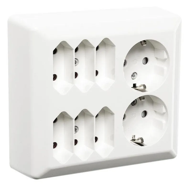 Pistorasia kuudella euro- + kahdella sukopistorasialla, pinta-asennukseen rasiaan tai suoraan seinälle. Mitat 126 x 115 x 43 mm. Kahta pistorasiapesää voi ohjata kytkimillä, voidaan käyttää vedonpoistajan kanssa.