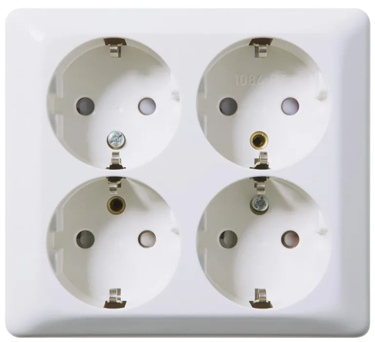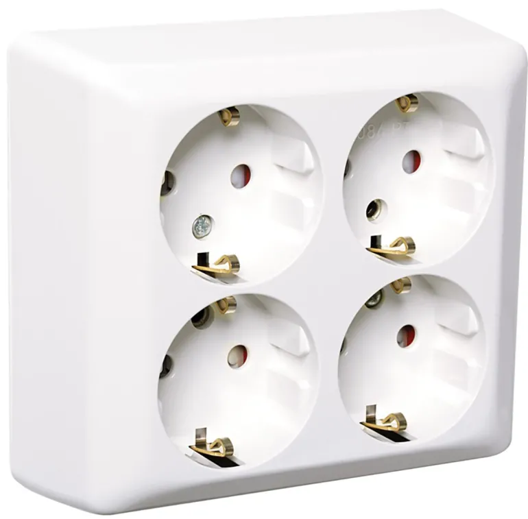 4-osainen, turvatyyppinen pistorasia. Sokkeli, kansi ja pohjalevy halogeenittomasta kestomuovista.