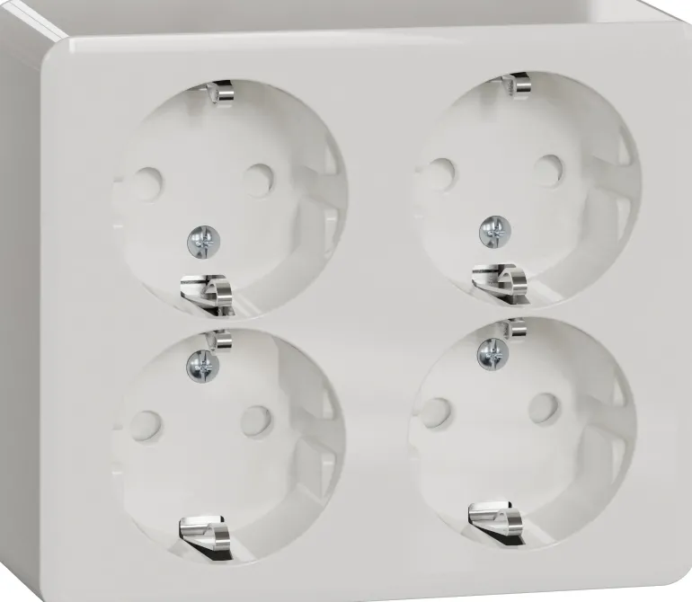 Tuote on helppo asentaa. 4-osaisessa pistorasiassa on parannetut merkinnät ja suurempia kaapelinvapautuspainikkeita. Pohjalevyssä on muita kiinnitysreikiä luotettavampaa kiinnitystä varten.