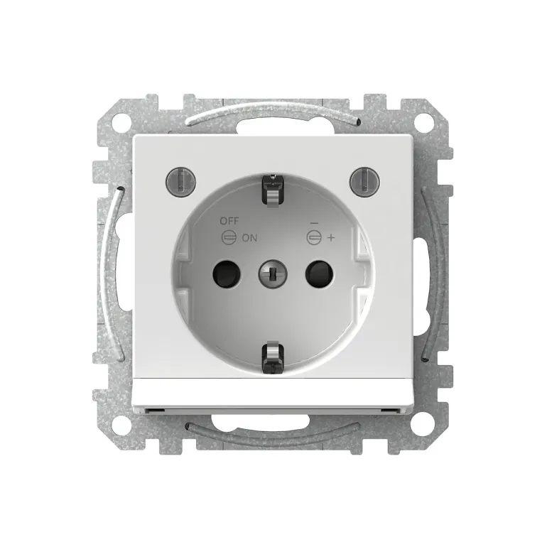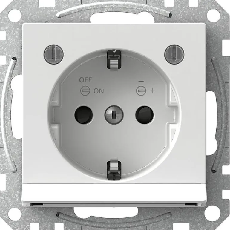 Maadoitettu, 1-osainen pistorasia, jossa säädettävä opasvalo. Pistorasiassa on ruuviliitäntä ja kosketussuojaus. Upotettavaksi kojerasiaan c/c 60 mm tai pinta-asennettavaksi 35 mm:n rasiaan.