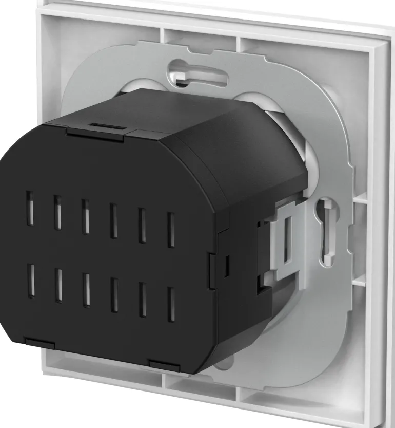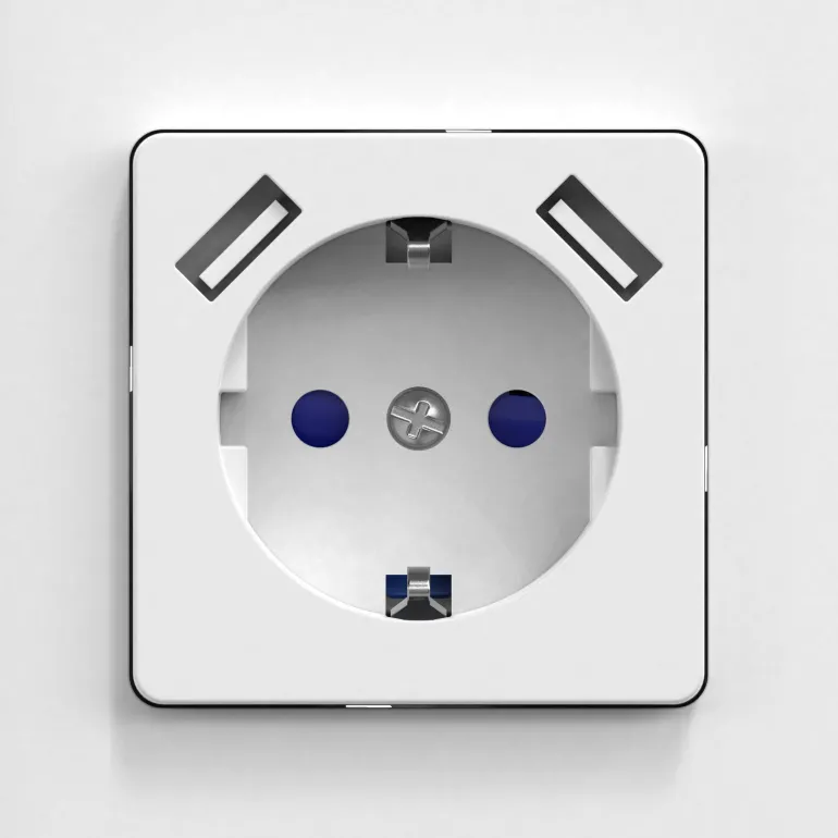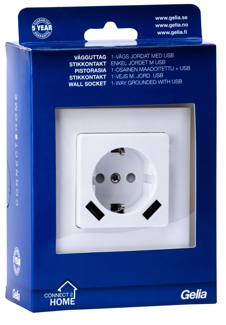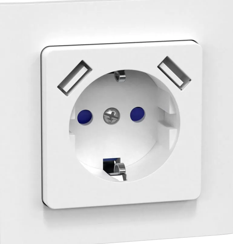 Seinäpistorasia kosketussuojalla ja kahdella USB-liitännällä, yhteensä 2,1 A. Ei mahdu Connect 2 Home -korotuskehykseen. Sisältää kiinnityskynnet, joita käytetään asennettaessa yksikkö vanhempiin kokoonpanoihin, sekä kynsisarjan ruuveilla.