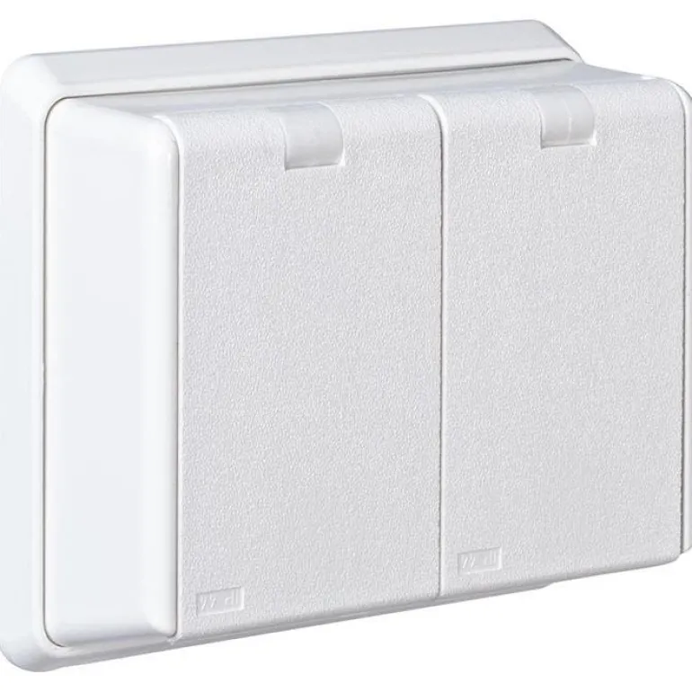 Maadoitettu seinäpistorasia uppoasennukseen kojerasiaan, jonka kiinnitysruuvien väli on 60 mm. Automaattisesti sulkeutuva saranakansi ja läpivientitoiminto, valmistettu halogeenittomasta kestomuovista.