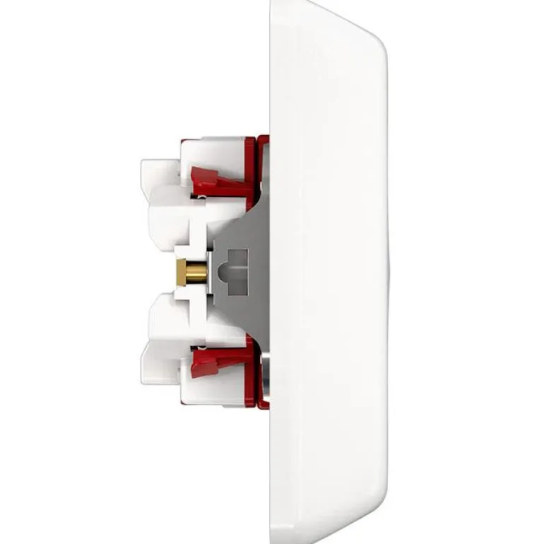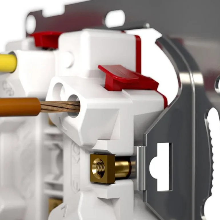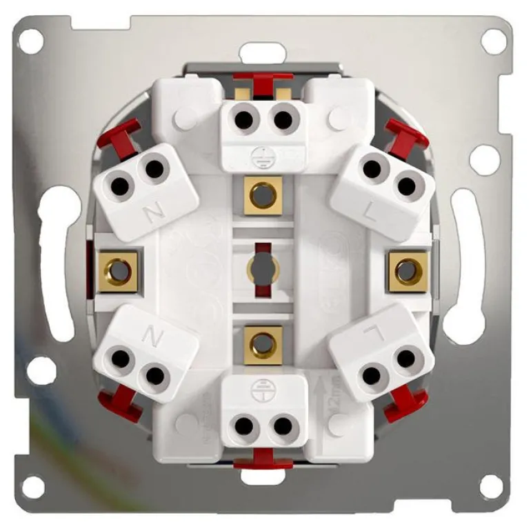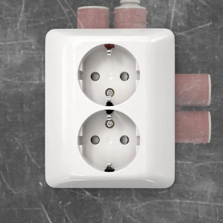Kaksiosainen pistorasia ”RS-pikaliitännällä” uppoasennukseen, mitat 104 x 84 x 49 mm. Uudenlainen pistorasia, jossa on käyttäjäystävälliset painikkeet johtimien irrottamista varten ja selkeä symbolimerkintä. Mallissa on myös 6 x 2 johtimelle FK ja EK. Kosketussuojattu sokkeli täyttää IP20:n vaatimukset myös ilman kantta.