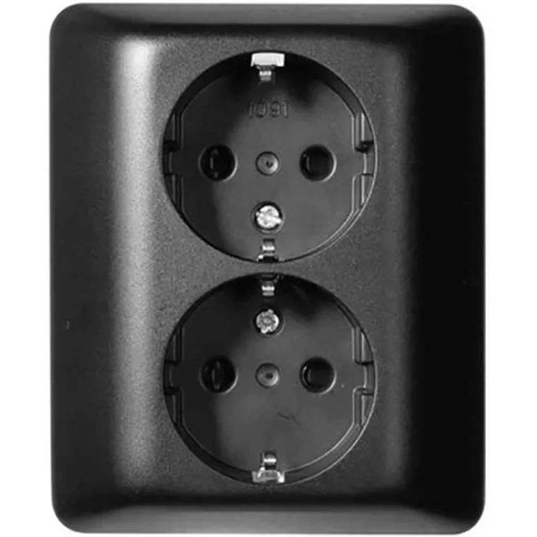 Pistorasia 2 pesällä ja ”RS-ruuvilla” uppoasennukseen, 16A, 250V. Pistorasian mitat ovat 104 x 84 x 43 mm ja se on väriltään mattamusta. Nimellisjännite on 250 V ja pistorasia on valmistettu halogeenittomasta kestomuovista.