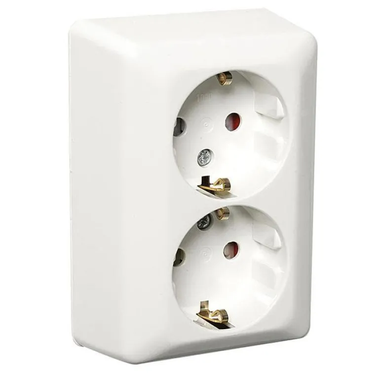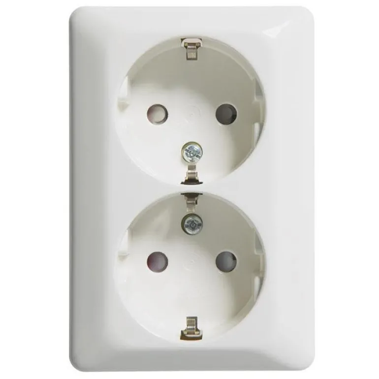 Kiiltäväpintainen pistorasia pinta-asennukseen. Kiinnitetään ruuveilla, mitat 104 x 71 x 41 mm. Pistorasia on maadoitettu ja siinä on halogeenittomasta muovista valmistettu sokkeli ja pohjalevy. Pohjalevyssä on syvennysaihiot 16 mm:n putkille.