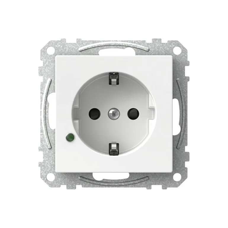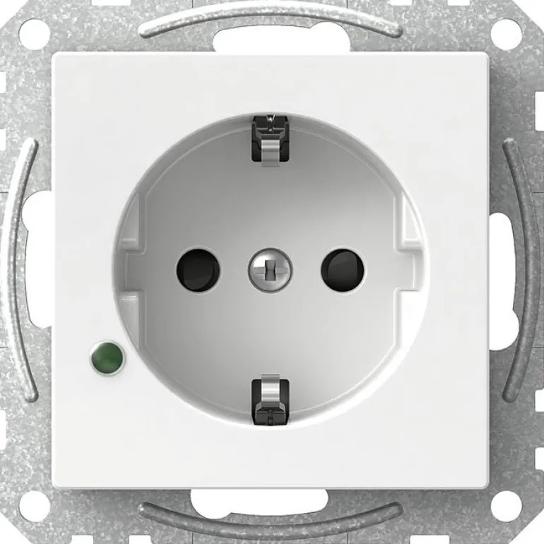 Maadoitettu, 1-osainen pistorasia, jossa on kosketussuojaus ja jonka vihreä LED-merkkivalo osoittaa, että pistorasiassa on jännitettä.