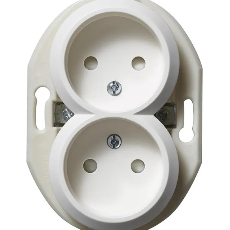 2-osainen, maadoittamaton pistorasia ruuviliitännällä. Upotettavaan IP20-asennukseen kojerasiaan c/c 60 mm. Toimitetaan kynsillä ja täydennettävissä valinnaisella 2-osaisten pistorasioiden Renova-kehyksellä.