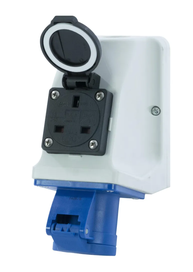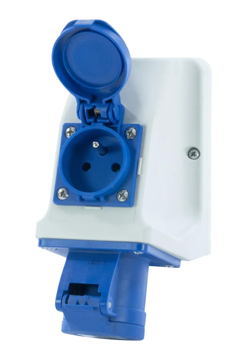 Seinään asennettava, kaapeliliitännöillä päältä ja pohjasta, 41 x 52 mm, sininen suko-pistorasia 230 V. Jos pistorasia asennetaan ulkotiloihin tai jos sitä todennäköisesti käytetään siirrettävien laitteiden käyttöön ulkotiloissa, ennen sitä on oltava moninapainen vikavirtasuoja, jonka suurin nimellinen laukaisuvirta on 30 mA.