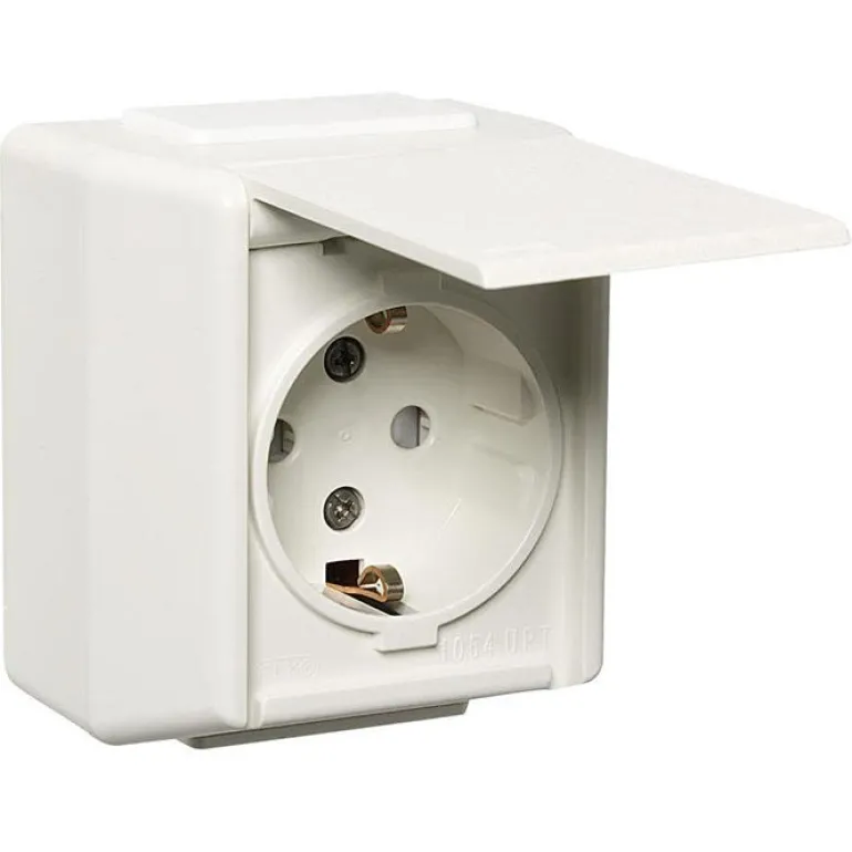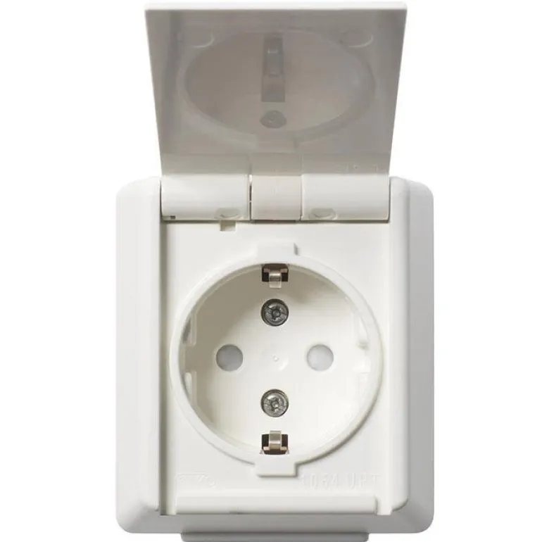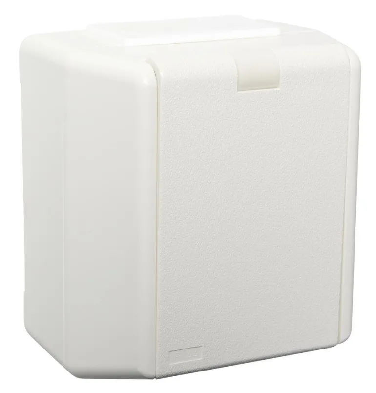 Yksiosainen pistorasia, jossa on kaksinkertaiset liitännät vaihetta kohti ja itsekiinnittyvä saranakansi. Läpivientitoiminnolla, kosketussuojauksella ja kalvonipoilla. Pinta-asennukseen, mitat 67 x 75 x 50 mm. Valmistettu halogeenittomasta kestomuovista, lisätilaa liitospuristimelle.