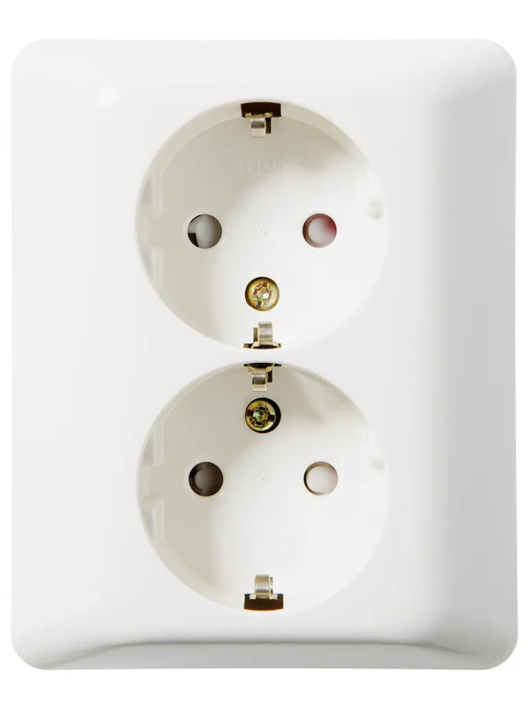 Upotettava 2-osainen Renvit-pistorasia RS-mallia. Maadoitettu ja varustettu kosketussuojatuilla pistorasioiden pesillä.