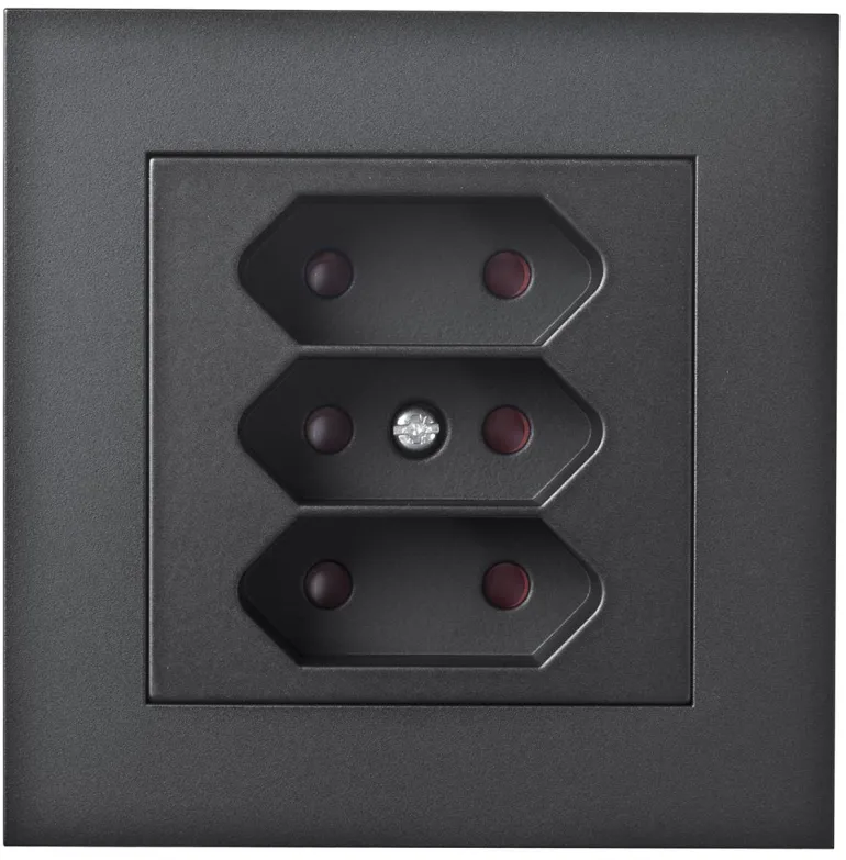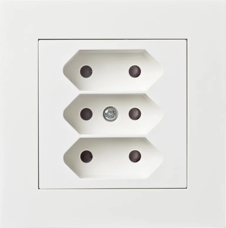 3-osainen pistorasia, jossa sokkeli, peitelevy ja kehys halogeenitonta kestomuovia. Kaksinkertaiset liitännät vaihetta kohti.
