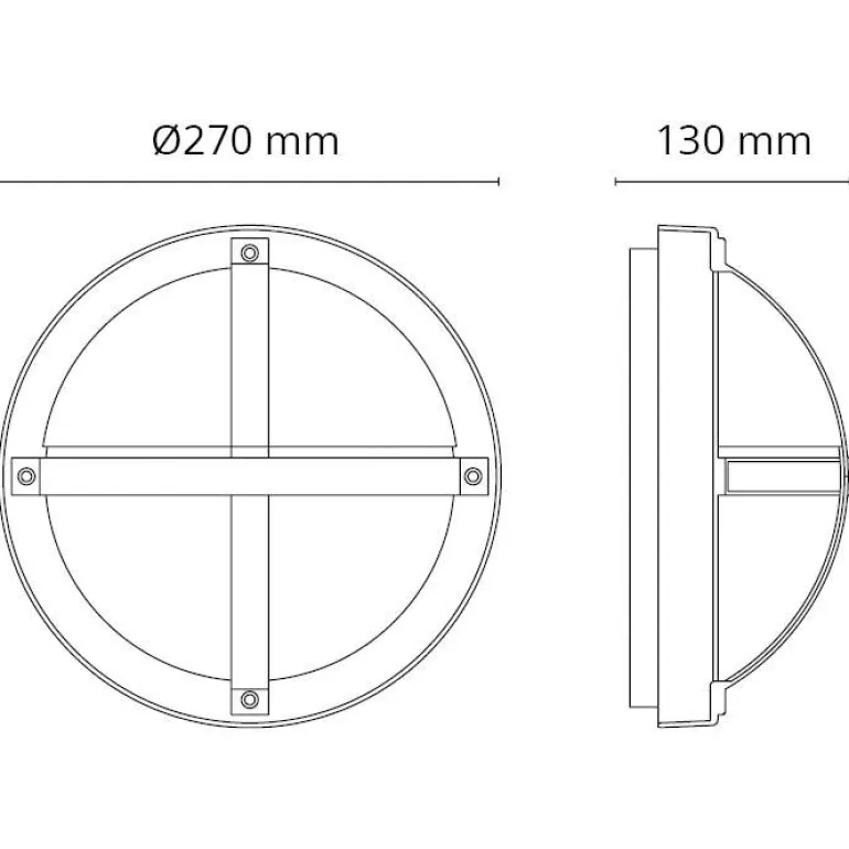 11,5 W:n seinävalaisin, jossa on tyylikäs, pyöreä ja puoliksi peitetty malli ristikkäisillä listoilla. Jauhemaalatusta valualumiinista. Kupu on valmistettu UV-stabilisoidusta opaalipolykarbonaatista. Valaisimen värilämpötila on 3000 K, valovirta 330 lm ja valon hajontakulma 120°.