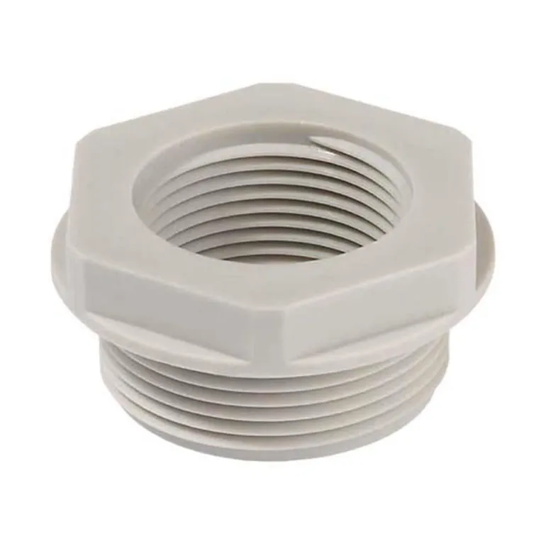 Muuntoliitin harmaata lasikuituvahvistettua polyamidia, RAL 7035. Pieni metrinen sisäkierre ja iso metrinen ulkokierre. Halogeeniton. Muovityyppi: Polyamidi 6 lasikuituvahvisteinen