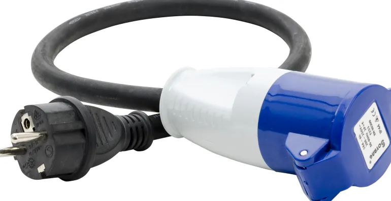Sovitin sisältää pistokkeen, 230 V (schuko), ja pistorasian, 216-6 CEE. Sovitin on hyväksytty ulkokäyttöön ja IP44-luokiteltu.