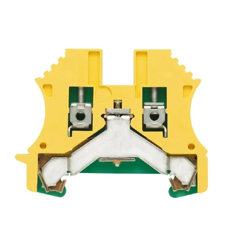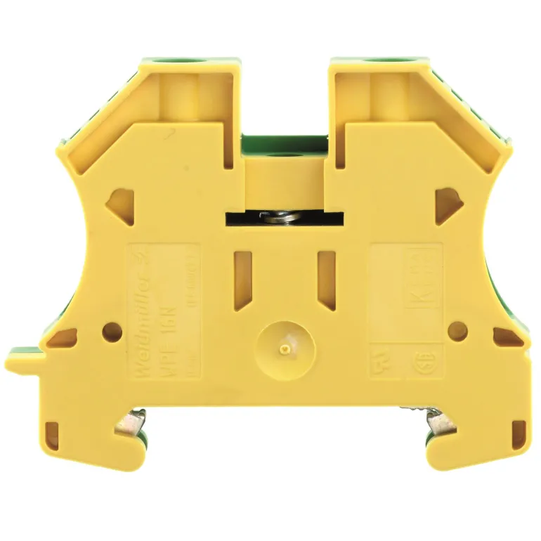 Weidmüller WPE 2.5N suojajohtimen riviliitin W-sarjassa. Suojajohtimen riviliitin ruuviliitännällä ja suoralla asennuksella. Kiinnityssanka ja ruuvi on valmistettu teräksestä, kun taas johdinkisko, joka on päällystetty tinaa olevalla lyijykerroksella, on valmistettu kuparista.