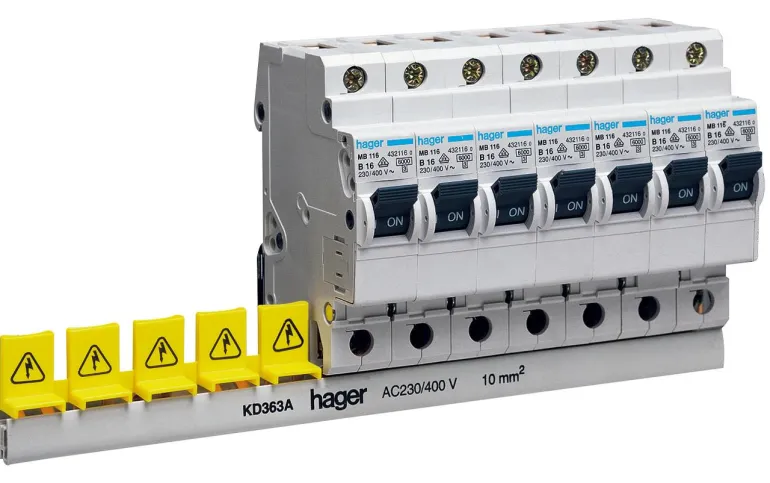 Kosketussuoja ulkonevalle vaihekiskolle. Viisi moduulia pituutta kohti.