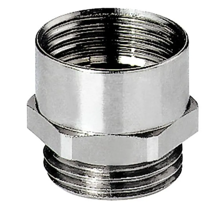Suurennusmuhvi nikkelipinnoitettua messinkiä, pienellä metrisellä ulkokierteellä ja suurella metrisellä sisäkierteellä.