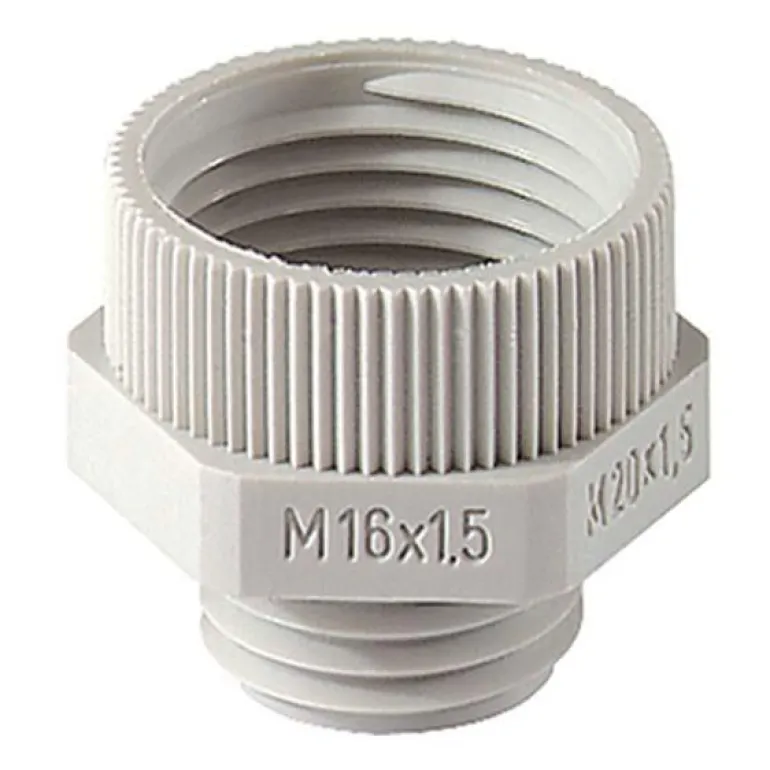 Harmaata lasikuituvahvistettua polyamidia, RAL 7035. Pieni metrinen ulkokierre ja suuri metrinen sisäkierre. Halogeeniton. Muovityyppi: Lasikuituvahvistettu polyamidi.
