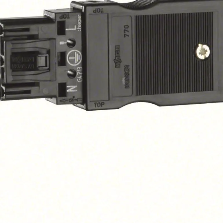 Irrallinen syöttöliitin Hagerin Ergeribuss-pikakytkentäjärjestelmään. Syöttöliittimessä on Wago-pikaliitin.