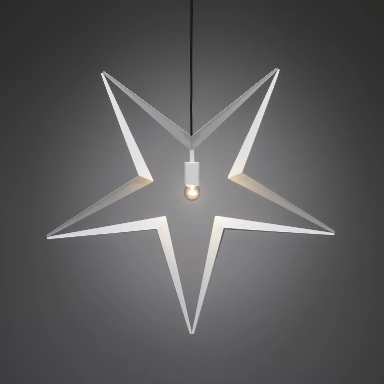 Valkoinen roikkuva tähti, 80 x 80 cm, 500 cm pitkä liitosjohto ja johtokytkin. Luokitus IP20 ja energiamerkintä A++-E. Himmennettävä valonlähteestä riippuen.