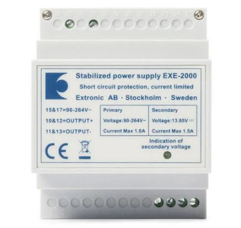 Tasasuuntaaja asennettavaksi DIN-kiskoon, joka sopii vakiokoteloon ja on virtapiiriltään rajoitettu/oikosulun kestävä, maks. 1,5 A. Ensiöjännite 230 VAC, toisiojännite 13,65 VDC/1,5 A. Lepoteho 20 VA.
