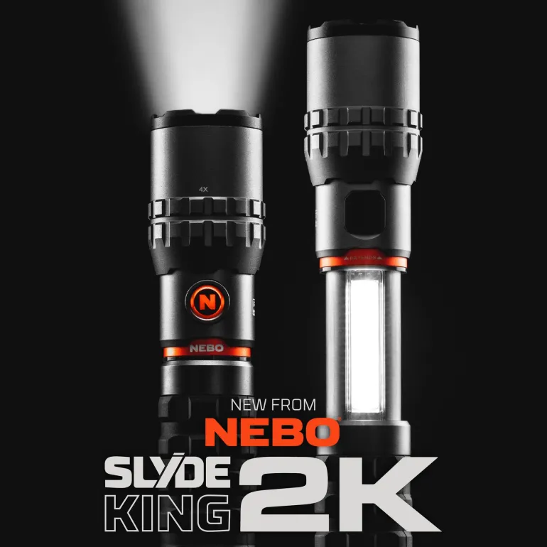 NEBO SLYDE King 2K on ladattava, vedenpitävä (IP67) ja erittäin monipuolinen taskulamppu, jossa on 4x-zoomi ja 500 luumenin C.O.B-työskentelyvalo. Kuuden tilansa ansiosta, joista tehokkain on valovirraltaan 2000 lm, se soveltuu eri käyttötarkoituksiin ja tilanteisiin. Jokaista valotilaa voi himmentää ohjelmoitavalla muistilla asteittain. Slyde Kingissä on myös ergonominen kumipintainen kahva ja tehokas magneettinen pohja. C.O.B-työskentelyvalo syttyy automaattisesti, kun lamppu sytytetään, ja sammuu, kun lamppu sammutetaan.