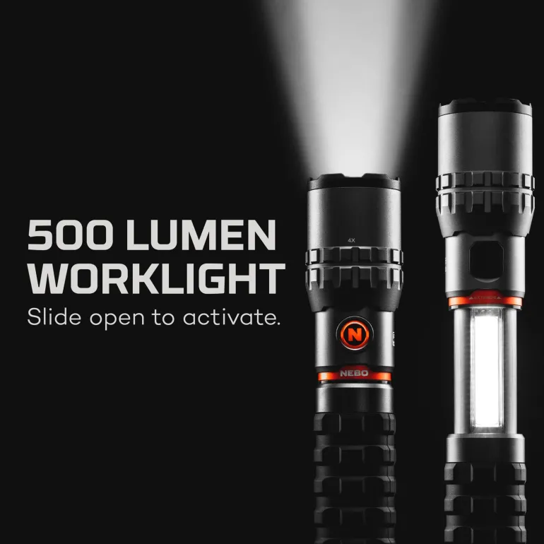 NEBO SLYDE King 2K on ladattava, vedenpitävä (IP67) ja erittäin monipuolinen taskulamppu, jossa on 4x-zoomi ja 500 luumenin C.O.B-työskentelyvalo. Kuuden tilansa ansiosta, joista tehokkain on valovirraltaan 2000 lm, se soveltuu eri käyttötarkoituksiin ja tilanteisiin.