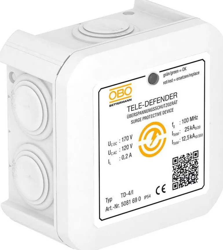 Tietoliikenteen ylijännitesuoja. Yhdistelmäsuoja salamoita ja ylijännitettä vastaan. ADSL:lle, ISDN:lle, analogiselle puhelinverkolle. Kansi UV-säteilyä kestävää halogeenitonta muovia IP54. Parille/2 johdolle. Suojaus johdin/maa & johdin/johdin. 2-vaiheinen suojakytkentä. Suurin jännite 120 V AC & 170 V DC. Impulssivirta 10/350 12,5kA. Nimellinen virta 8/20 25kA. Suurin siirtotaajuus 100 MHz. Liitoksen vaimennus 0,1 a/DB 144 kHz:n taajuudella. Pituussuuntainen vastus 9 ohmia. Suojaustaso (johdin/maa) 650 V (johdin/johdin) 300 V. LED-merkkivalo vihreä OK, punainen ei suojaa.