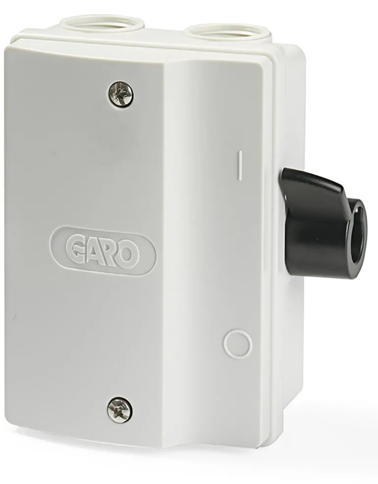 Garo SBG 316G on turvakytkin, jossa on lukittava sivukahva. Kytkimessä on murrettavat reiät kaapelin sisääntuloa varten ylös ja alas varten ja se on varustettu IP65-tiivistysnipalla. Eristävästä, iskunkestävästä ja korroosionkestävästä materiaalista valmistettu kotelo.