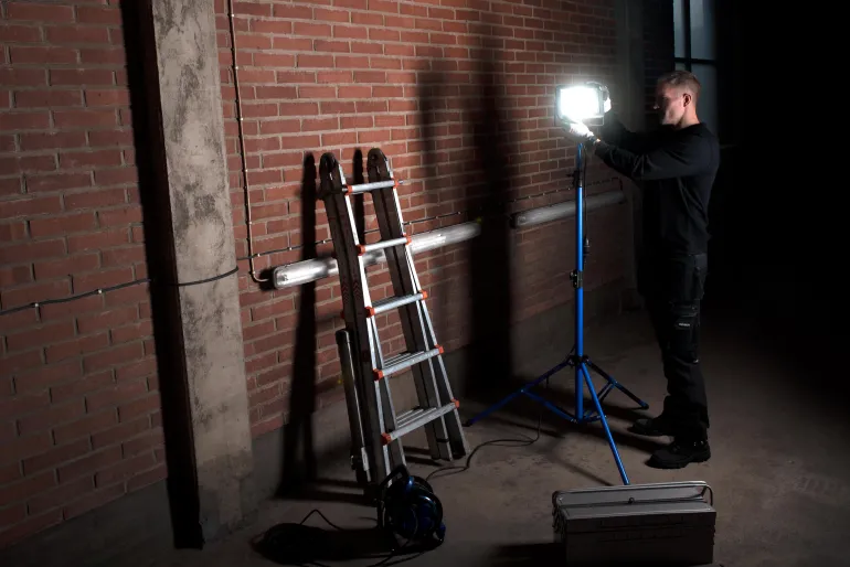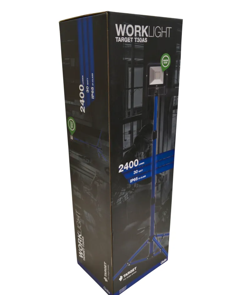 TARGET T30AS on vankka ja tehokas LED-työvalaisin, jossa on teleskooppiteline. Työvalaisimessa on 30 watin LED-valonheitin, jota voidaan kääntää, mikä helpottaa valon suuntaamista.