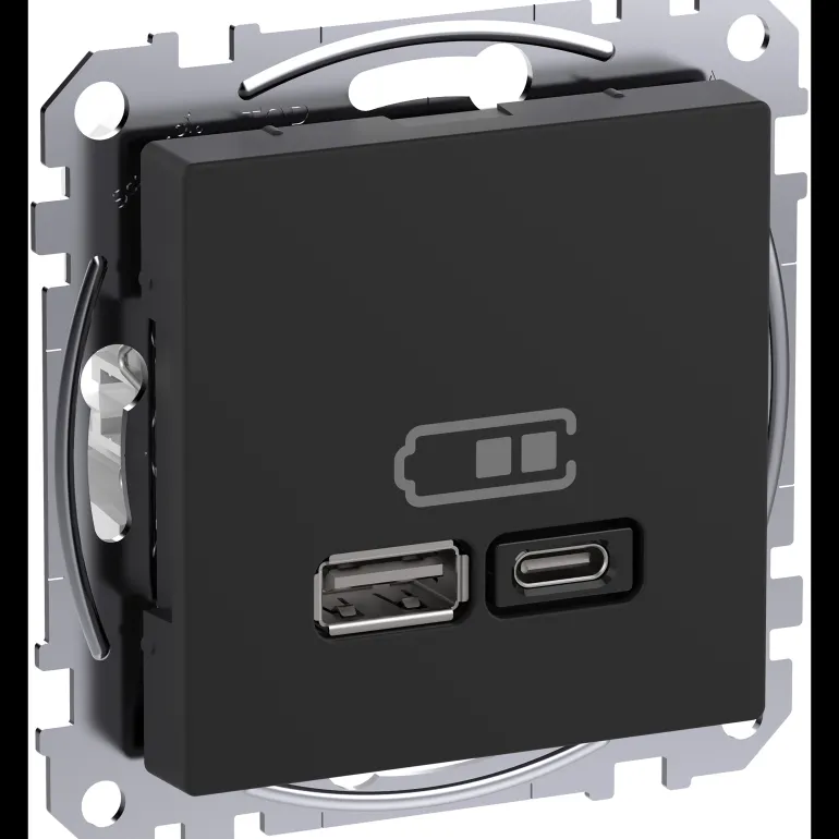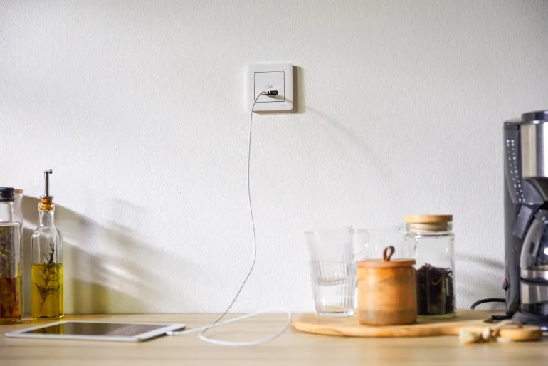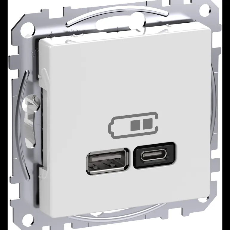 Exxact USB-latausasema tyyppi A+C asennetaan seinälle USB-kaapelilla varustettujen laitteiden lataamista varten. Pistorasiassa on kaksi lähtöä, joiden avulla voidaan ladata kahta laitetta samanaikaisesti. Se voi ladata tyyppiä A 7,5 W ja tyyppiä C 45 W tehotoimituksella. Kosketussuojattu pistorasia, uppoasennus laiterasiaan c/c 60 mm. Pinta-asennukseen käytetään 35 mm:n rasiaa. Voidaan täydentää millä tahansa Exxact-kehyksellä.
