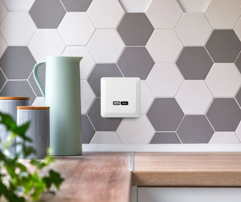USB-latauspistorasia USB A- ja C-portilla, joka mahdollistaa kahden laitteen samanaikaisen latauksen. Power Delivery-tekniikalla USB-C portista saa jopa 45W lataustehon, joka älypuhelimen lisäksi mahdollistaa esim. kannettavan tietokoneen tehokkaan latauksen. Power Delivery-tekniikka mahdollistaa annettavan virran määrittelyn ladattavan laitteen mukaan, mikä mahdollistaa aina optimaalisen ja turvallisen latauksen. Power Delivery lataa aina liitetyn laitteen sallimalla suurimmalla teholla.